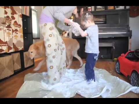 It started off innocent enough, we dipped our hands in the shaving cream. And that led to using our feet like bulldozers plowing the shaving cream "snow". And then we got a little wild and went shaving cream skating!